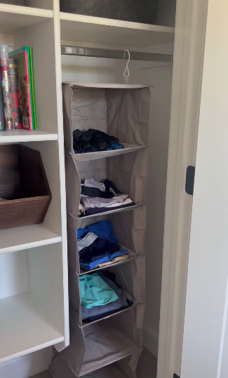 Get yourself a 6-shelf pants closet organizer from Amazon, Walmart, Target, etc. The cloth, canvas type material ones are great. They’re lightweight and super easy to hang up from the bar in your closet. Hang the organizer up inside your kid’s closet.
