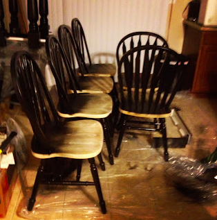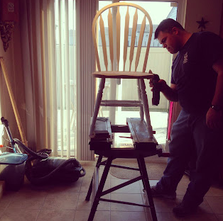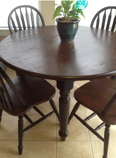 We were able to borrow leftovers of a customized stain that my dad had for the wood for the table refinish. Then, we purchased black spray paint for the chair and table legs. All in all, we saved a lot of money, and have a beautiful brand new table!