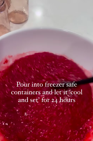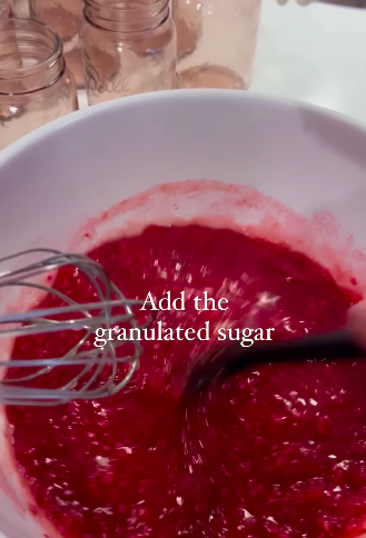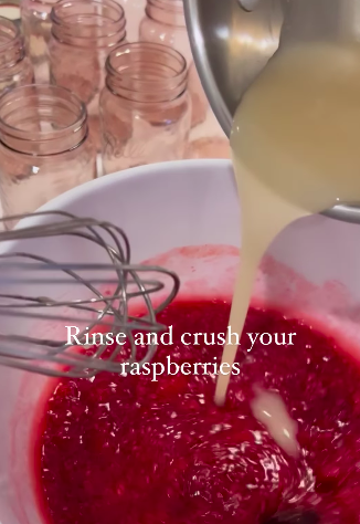 ☀️Stir in 1 cup of the sugar into the raspberry mixture and stir well until the sugar is dissolved. Stir in remaining 4 1/4 cups sugar until dissolved. Let raspberry/sugar mixture sit for 10 minutes.