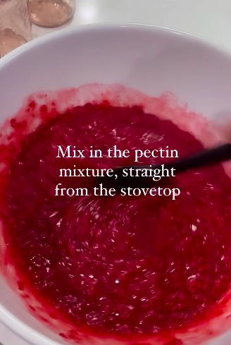 ☀️In a small sauce pan, stir together the Sure-Jell pectin and 3/4 cup water. Bring to a boil, and boil for 1 minute. Remove the pan from heat, and immediately stir the pectin mixture into the raspberries. Stir constantly until the mixture is dissolved.